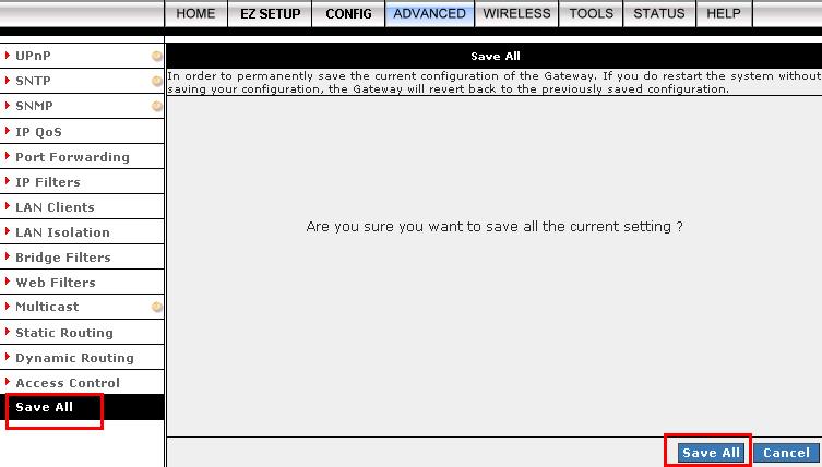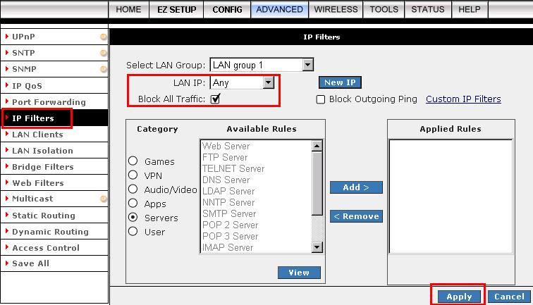 | The IP Filters configuration  allows you to specify normal Port Forwards, Block traffic to specific LAN Clients or